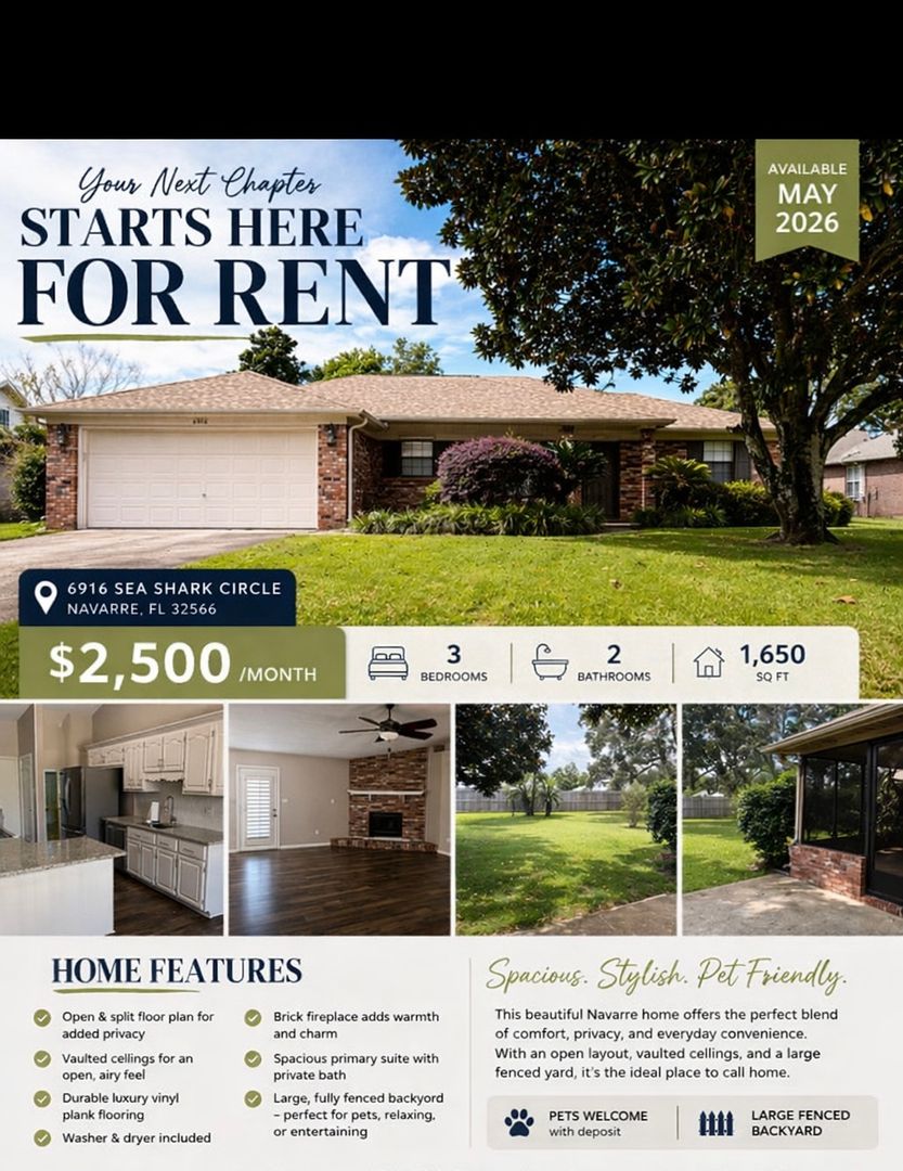 Beautiful 3 bedroom, 2 bathroom all brick home with a 2-car garage, situated on a quiet cut-de-sac in a desirable area of Navarre. This home features LVP and tile flooring throughout (no carpet), and granite counter tops, offering a clean feel and easy maintenance.